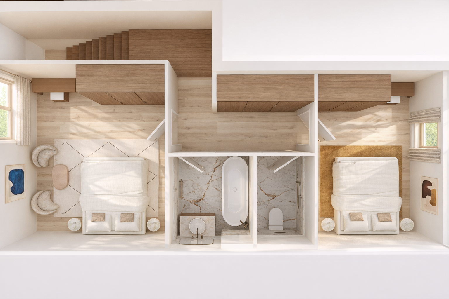 – À l’étage, vous trouverez deux chambres, une salle de bains et un WC séparé.