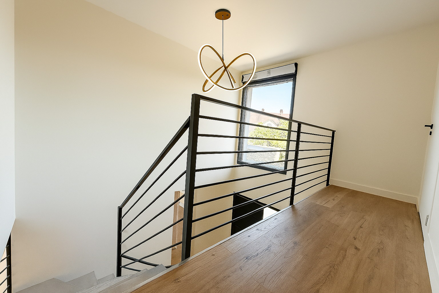 Les façades élégantes sont recouvertes d’un enduit de ton pierre, agrémentées de parements en pierres naturelles. L’ensemble est parfaitement harmonisé avec des fenêtres et portes-fenêtres en PVC, équipées de volets roulants gris anthracite. Les portes d’entrée et du garage, également en métal gris anthracite, renforcent le style contemporain de cette maison.